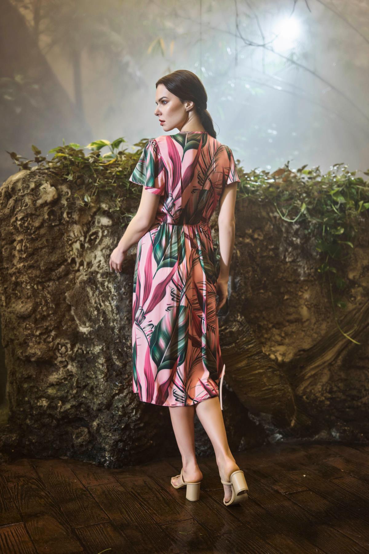 Elbise: V yakalıdır, kısa kolludur, vişne renklidir, yaprak desenlidir, önü parçalı ve düğmelidir, dokuma kumaştır.
