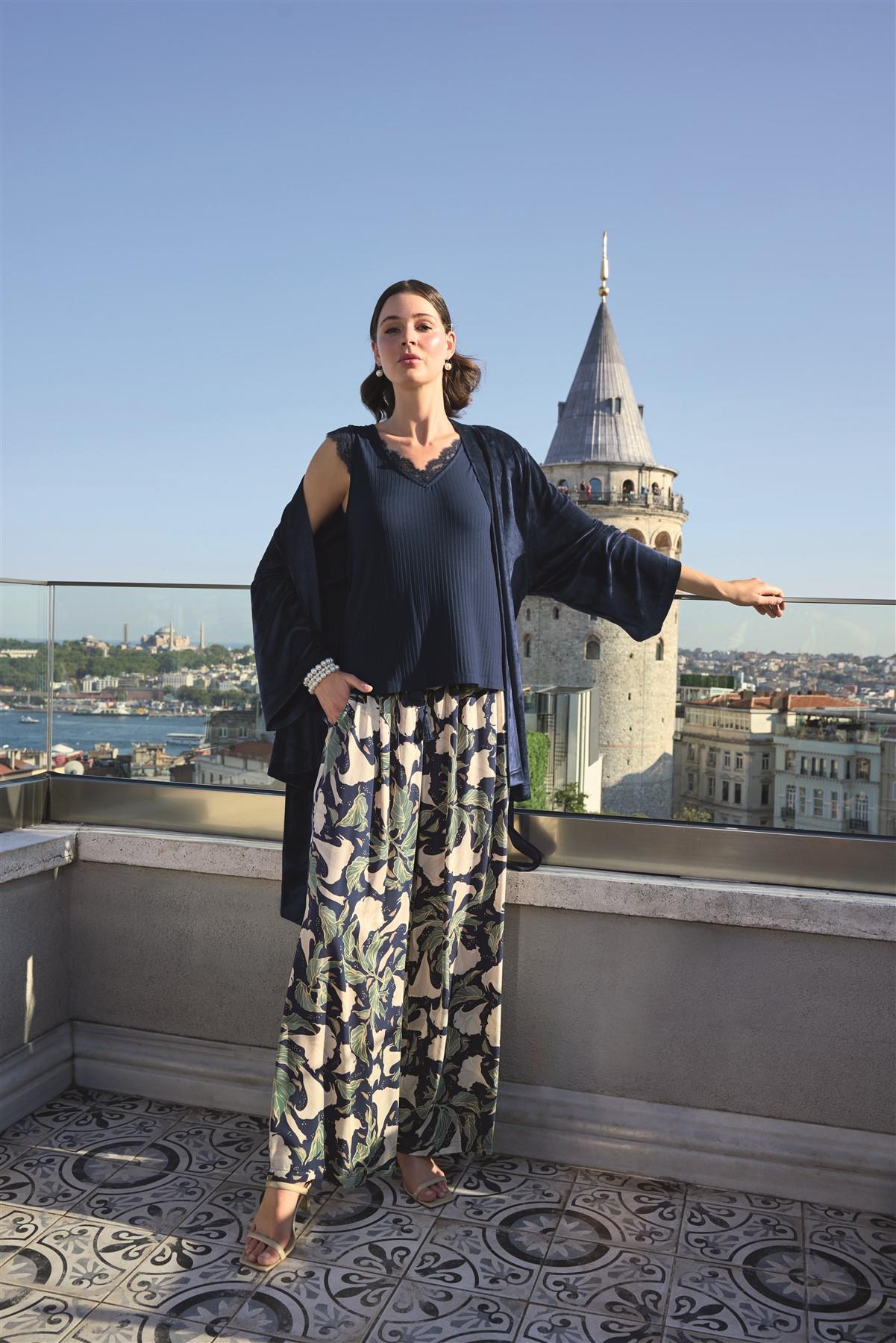Sabahlık: Lacivert renklidir, kuşaklıdır, kadife kumaştır.Üst: Lacivert renklidir, V yakalıdır, kalın askılıdır, yakası ve askı kısmı dantellidir, örme kumaştır. Alt: Lacivert zemin üzerine çiçek yaprak desenlidir, ceplidir, dokuma kumaştır.